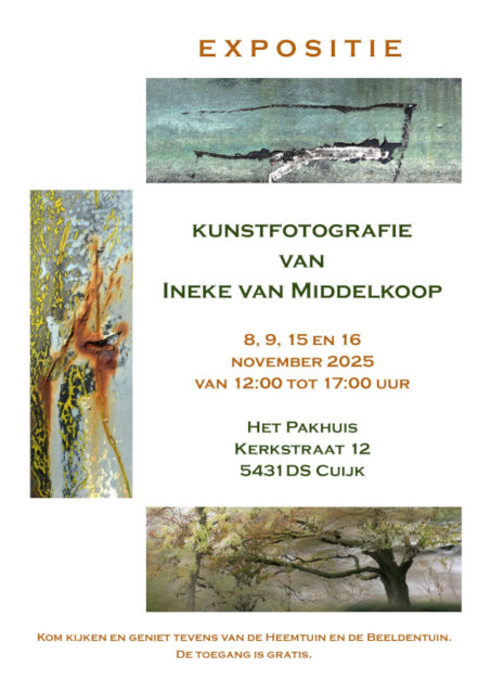 8, 9, 15 en 16 november 2025: Expositie in Het Pakhuis, Kerkstraat 12, 5431DS Cuijk.